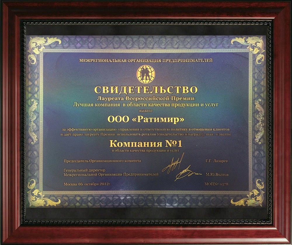 В 2012 году мы стали лауреатом Ежегодной национальной премии в области делового имиджа, репутации и доверия «КОМПАНИЯ № 1», победив в номинации «Лучшая компания в области качества товаров и услуг».