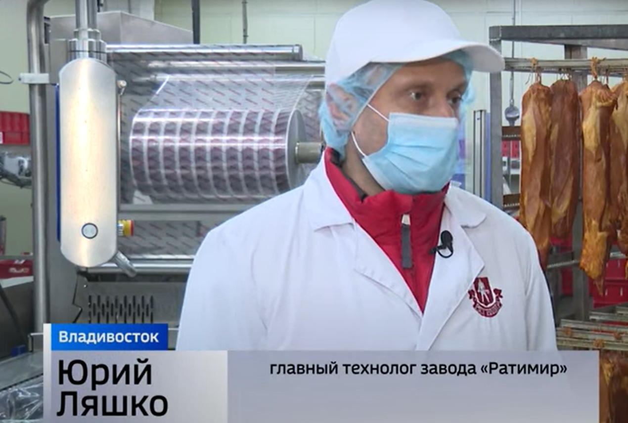 Юрий Ляшко, главный технолог завода «Ратимир»: «Выпускаем колбасные изделия, докторская, как в полиамидной оболочке, так и в классической целлюлозной оболочке, которая позволяет сохранить сочность продукта, улучшить его нежность».